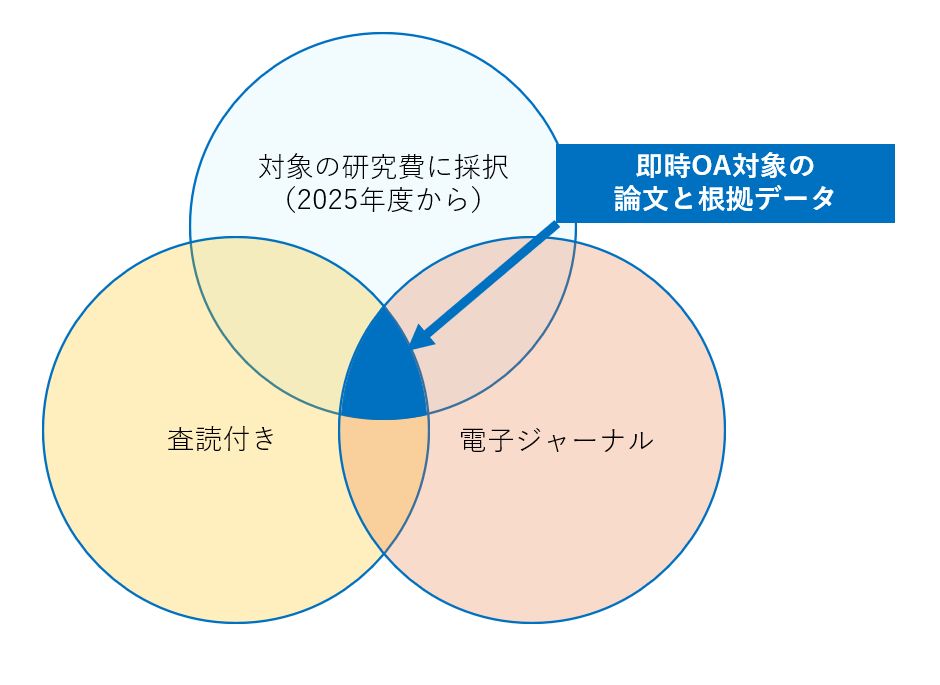 令和6年2月16日、内閣府統合イノベーション戦略推進会議により「学術論文等の即時オープンアクセスの実現に向けた基本方針」が策定されました。この方針の中で、一定の条件を満たす公的資金を用いた研究成果は、2025年度採択分から即時OA(オープンアクセス)が義務化されました。